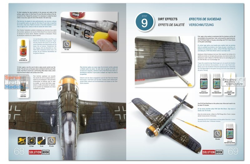 With this Premium Solution Book, you can create any Luftwaffe fighter with late World War II camouflage, including iconic aircraft such as the Bf 109, Fw 190, Me 410, Bf 110, He 219, and Me 262 among others. Some of the techniques described are optional, and it is up to you to decide whether or not to apply them. If you want to improve your painting and weathering techniques, we recommend that you try to apply them all. This book shows the most suitable products for creating the effects described. If you follow the order of application and drying times, you will be rewarded with excellent results. You can recreate any level of wear and tear on your models by varying the intensity of each effect. The model used in this book is Revell’s 1/32 scale Focke Wulf Fw 190 F8.