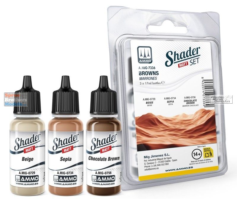 A set of Matt Shader brown tones ideal for adding depth and weathering effects to models, accessories, and dioramas.