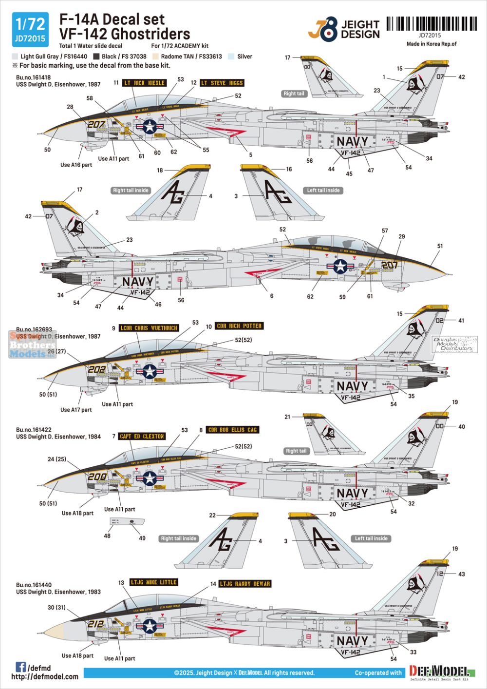 DEFJD72015 1:72 DEF Model Jeight Design Decal Set - F-14A Tomcat VF-142 Ghostriders (ACA kit)