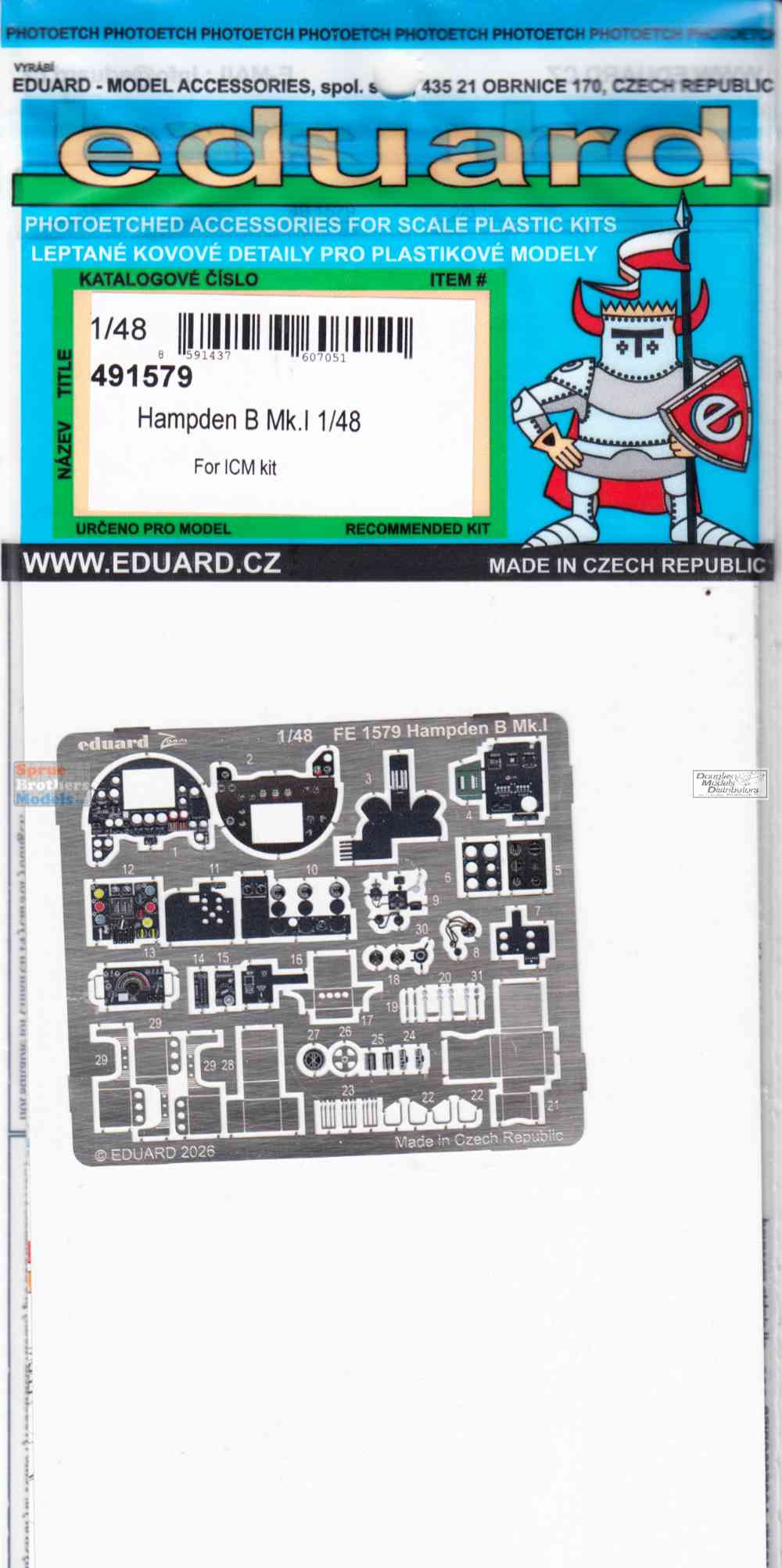 EDU491579 1:48 Eduard Color PE - Hampden B Mk.I Detail Set (ICM kit)