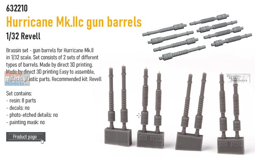 Brassin set gun barrels for Hurricane Mk.II in 1/32 scale.