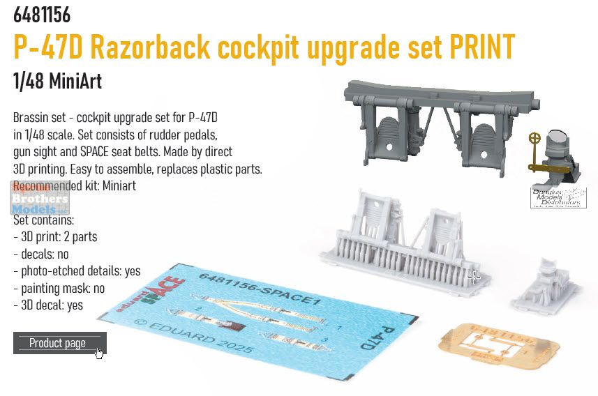 EDU6481156 1:48 Eduard Brassin - P-47D Thunderbolt Razorback Cockpit Upgrade Set (MIA kit)