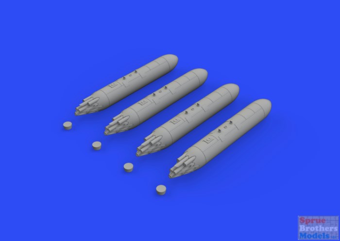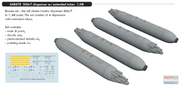 Brassin set - the US cluster bombs dispenser SUU-7 in 1/48 scale. The set consists of 4 dispensers with extended tubes.