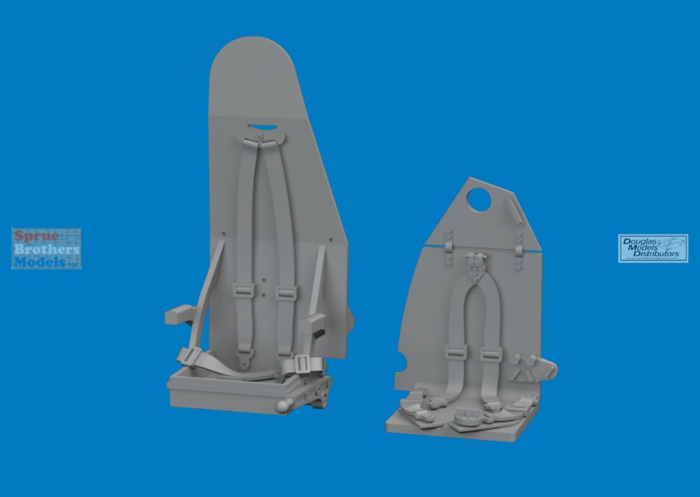 Brassin set seats w/ integral seat belts for Mosquito in 1/72 scale.