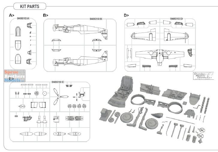 - Plastic parts: fuselage, wings, propeller, canopies, control surfaces, landing flaps, clear parts, and more