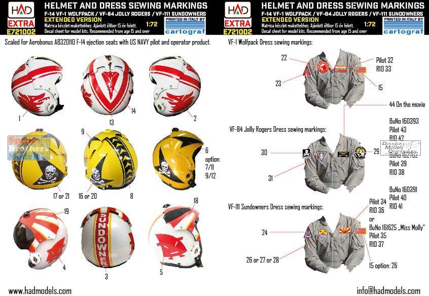 HADE721002 1:72 HAD Models Decals - F-14A Tomcat Helmet & Dress Sewing Markings for VF-1 VF-84 VF-111
