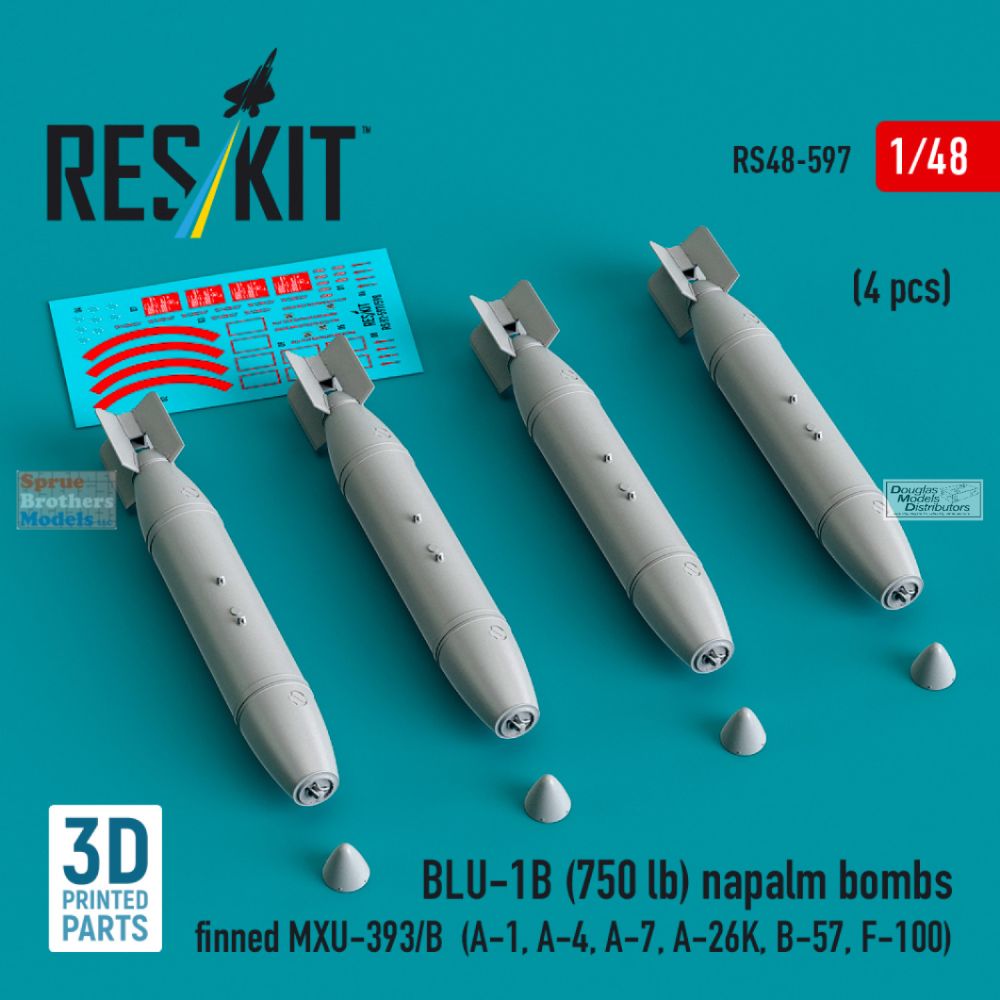 RESRS480597 1:48 ResKit BLU-1B (750lb) Napalm Bomb Set Finned MXU-393/B