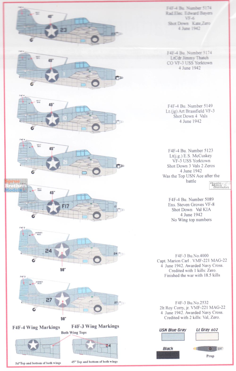Markings for 5 USN F4F-4 Wildcats and 2 USMC F4F-3 Wildcats. Markings for Thatch, Brassfield and McCuskey from VF-3, Byers from VF-6, Groves from VF-8, and Carl and Corry from MAG-22