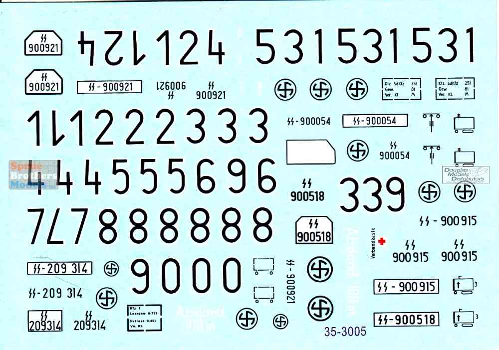 Sdkfz 223, SdKfz 250/7, SdKfz 251 D; Ford Maultier, Kubelwagen, + generic numbers.